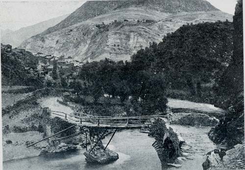Pont damunt el riu Noguera Pallaresa al Pallars Sobirà a la carretera que va cap al Port de la Bonaigua. Foto feta cap a l'any 1915. Els pobles de Jou i Àreu, a prop d'aquest pont, són bressols d'una de les branques de Betrius documentada per primer cop l'any 1553.