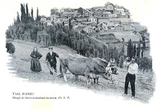 Foto d'una escena camperola en un poble indeterminat de la Vall d'Aneu a començaments del segle XX.