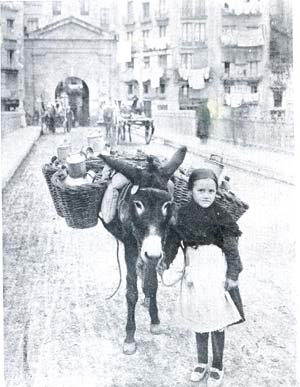 Noia pagesa de l'horta que de bon matí torna amb la seva somereta de portar cantirs de llet a Lleida. Foto feta cap a l'any 1915 al Pont Vell de Lleida.